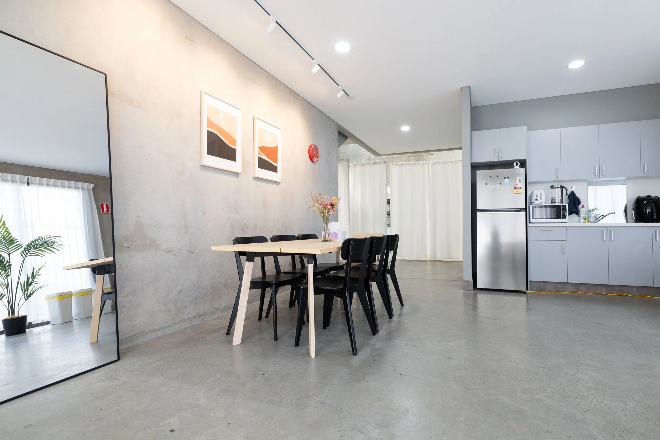 Opposite the studio is a kitchenette, lounge and dining area, wrapped in soft natural light, it’s the ideal location for creating effortless social media content or for taking a break. An additional 30sqm of space, included with all bookings.