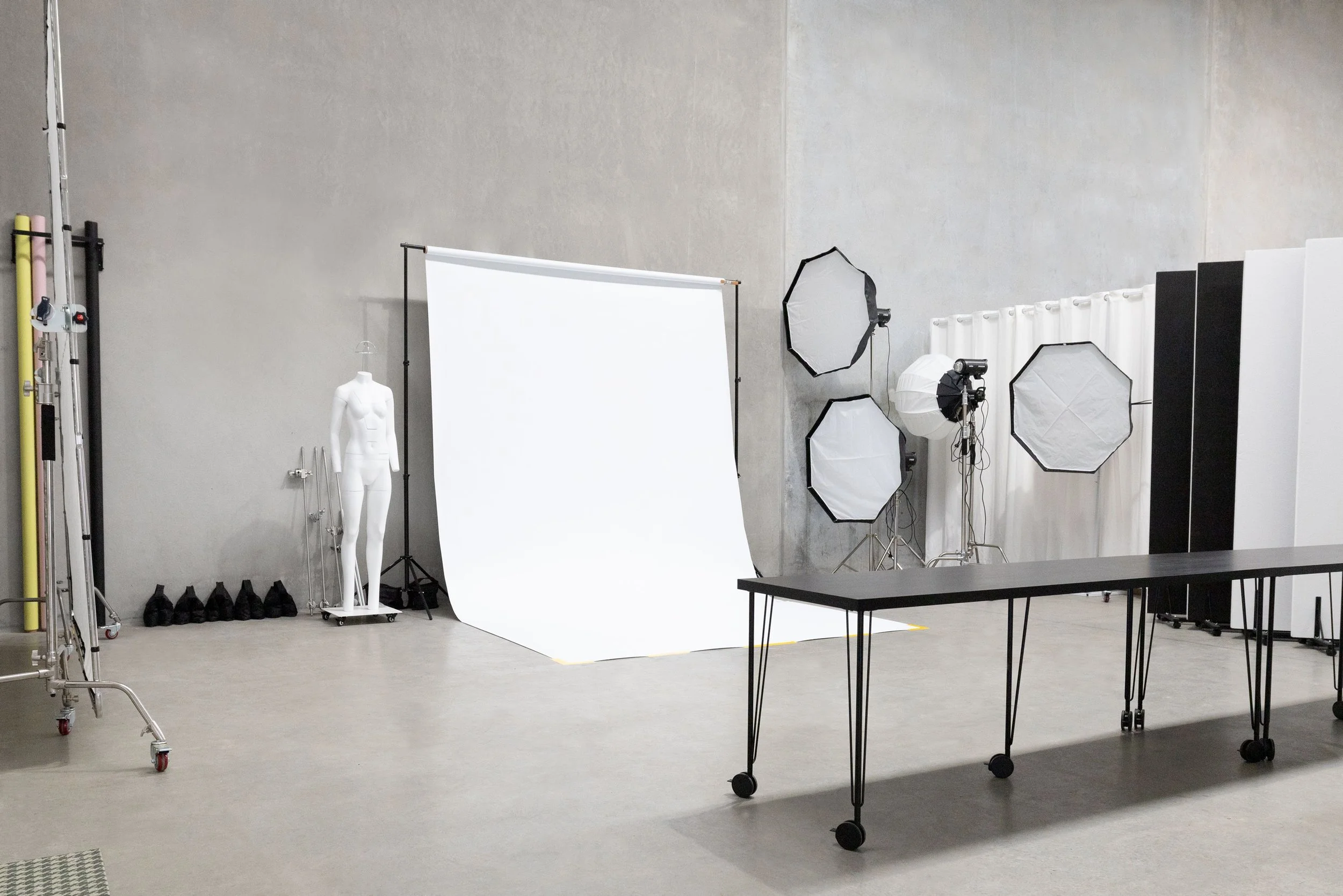 Studio A is a large 75sqm studio, perfect when working with models. Unleash the full potential of your next creative project with the versatility of robust concrete floors and soaring 8m high ceilings or keep it simple with clean paper rolls. An abundance of natural light is also available via a container-sized roller door. Easily move around equipment with wheels on our c-stands, polyboards, desks, clothing rack and XL scrim!